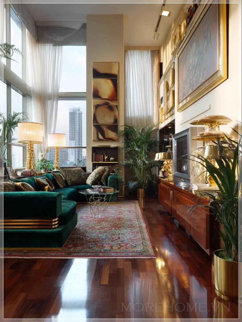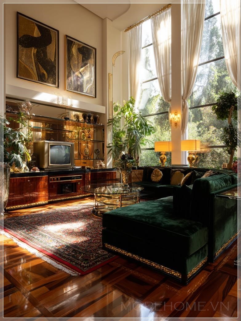 Ánh sáng tự nhiên ngập tràn căn phòng, khiến không gian trở nên bừng sáng và rộng rãi. Những cửa sổ lớn từ sàn đến trần, với rèm nhung trắng tinh tế và thêu vàng sang trọng, như tô điểm thêm cho vẻ đẹp của phòng khách cổ điển này. Trung tâm của căn phòng là một chiếc ghế sofa nhung xanh lục đậm, được trang trí bằng các chi tiết vàng tinh xảo, cùng với những chiếc gối mềm mại, tạo nên sự thoải mái và sang trọng không thể cưỡng lại.