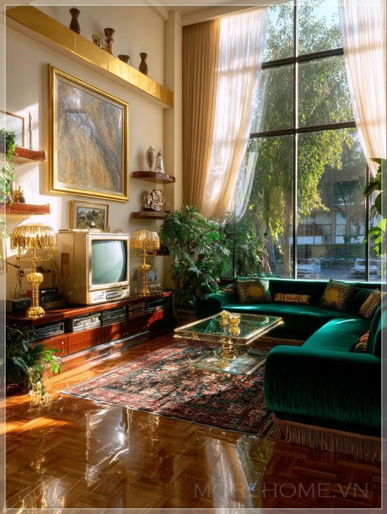 Ở một góc phòng, chiếc kệ tivi bằng gỗ với lớp sơn bóng mịn chứa chiếc tivi CRT vintage, hai bên được chiếu sáng bởi những chiếc đèn bàn bằng đồng và thủy tinh. Những chiếc đèn đứng với chân bằng pha lê mang đến sự sang trọng, tôn vinh không gian sống. Những chiếc kệ sách gỗ được trang trí bởi các món đồ trang trí viền vàng, bộ đồ sứ tinh xảo và một bộ sưu tập đĩa nhạc vinyl cổ điển.