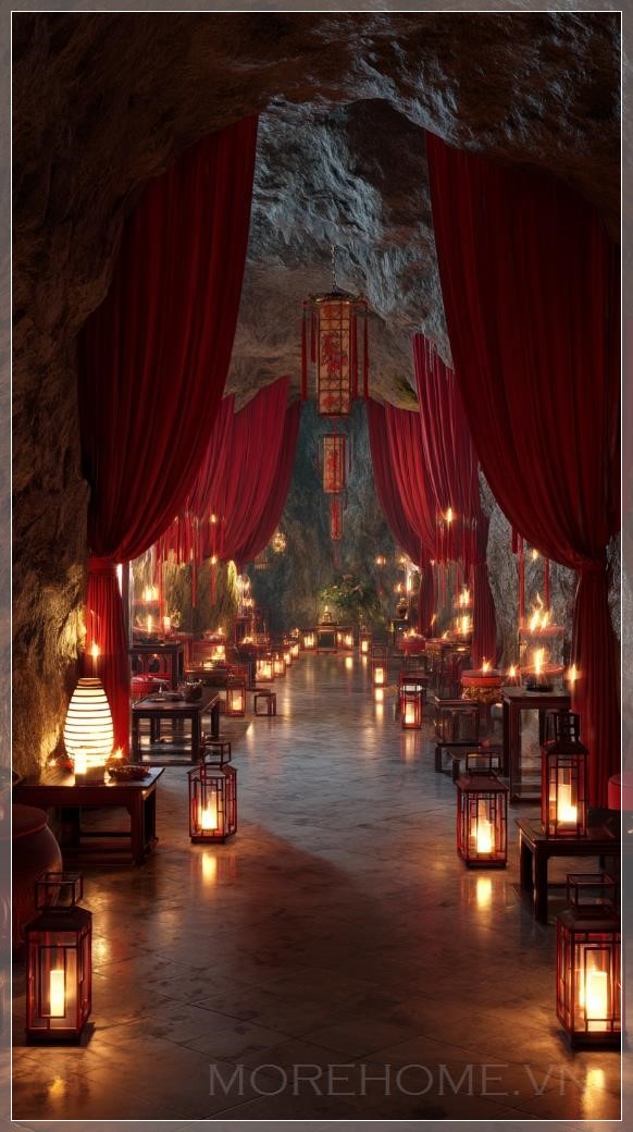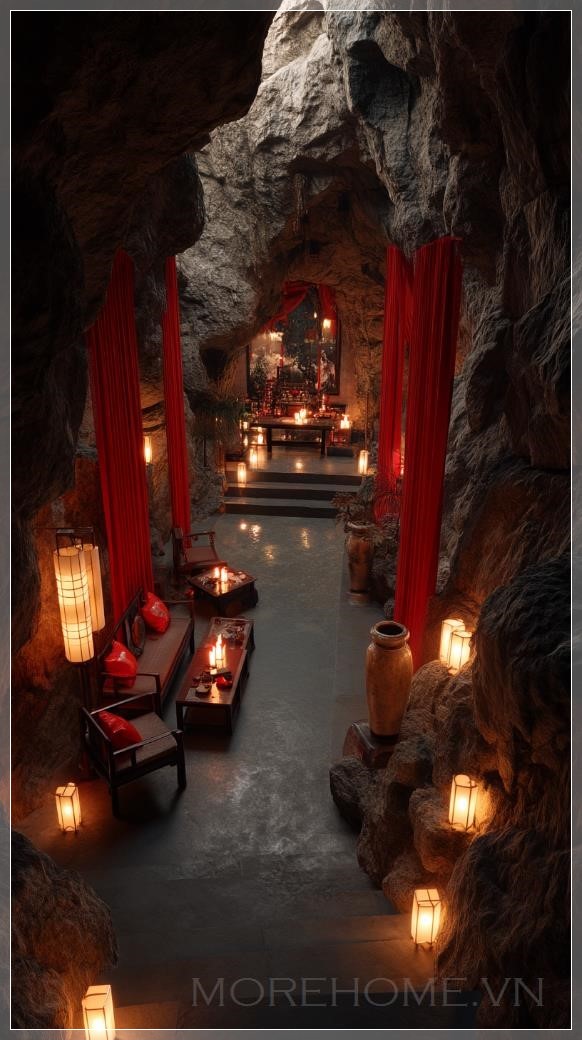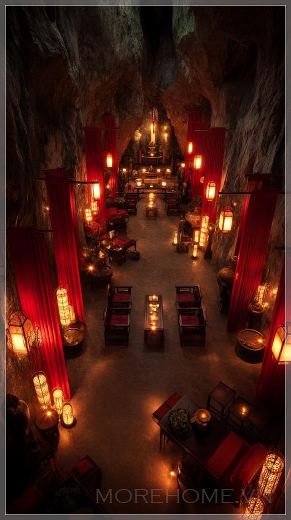 Nhìn từ trên cao xuống, bố cục trung tâm của không gian hiện ra như một bức tranh hoàn hảo. Một khoảng trống rộng mở nằm chính giữa, được bao quanh bởi những bức màn đỏ thẫm buông xuống từ trần hang như thác máu đông cứng. Màu đỏ rực rỡ của những tấm rèm tương phản mạnh mẽ với màu xám tối của đá, tạo nên một điểm nhấn không thể rời mắt.