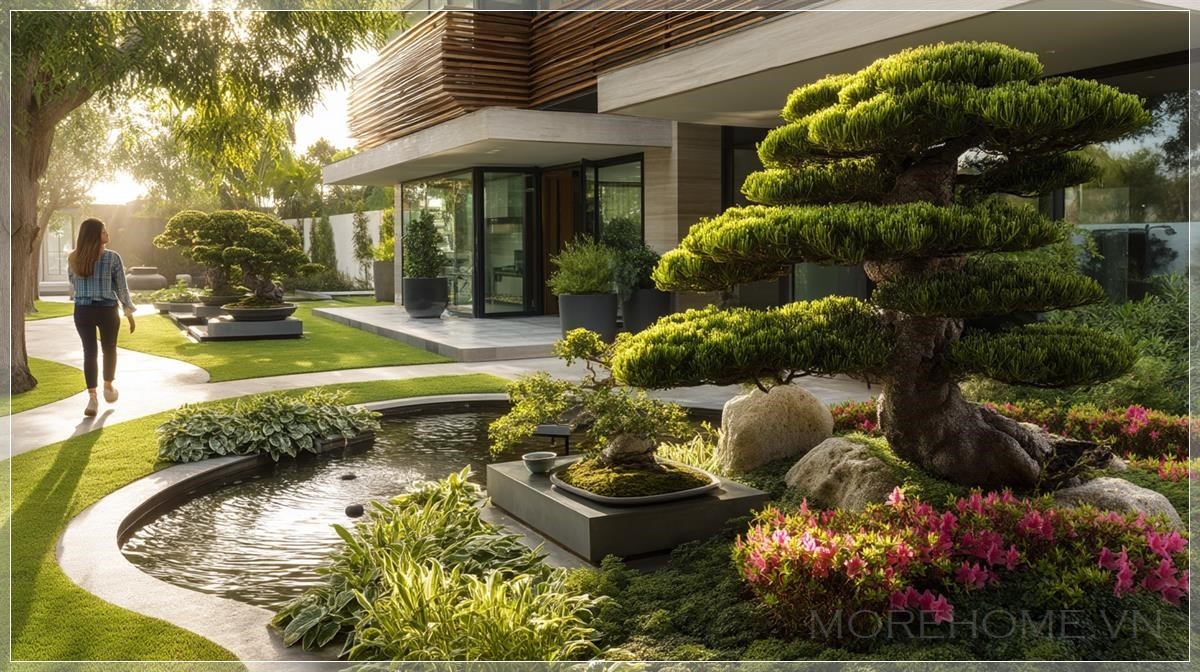 Điều đáng chú ý nhất về khu vườn này là cách các yếu tố được sắp xếp tạo nên chiều sâu không gian. Từ những bụi hoa nhỏ ở tuyến đầu, qua những cây bonsai ở giữa, đến ngôi nhà hiện đại ở phía sau - tất cả đều được bố trí theo một trình tự hợp lý, tạo nên một không gian thoáng đãng, thoải mái để thư giãn và chiêm ngưỡng.