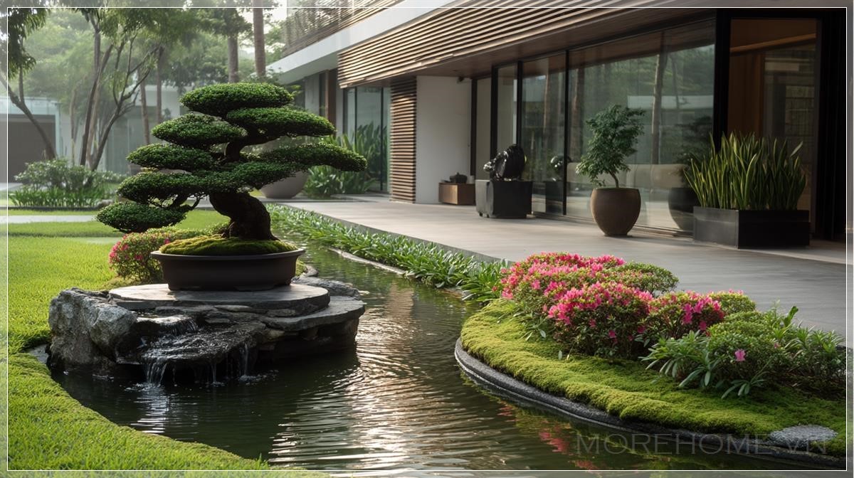 Âm thanh róc rách nhẹ nhàng dẫn lối đến một thác nước mini, nơi dòng nước trong vắt chảy xuống hồ nhỏ được viền quanh bởi những thảm rêu xanh mềm mại. Tiếng nước chảy tạo nên một bản nhạc thiên nhiên dịu êm, làm dịu tâm hồn và tạo cảm giác thư thái cho không gian. Những viên đá cuội được sắp xếp khéo léo xung quanh, tạo nên vẻ đẹp mộc mạc nhưng không kém phần tinh tế.