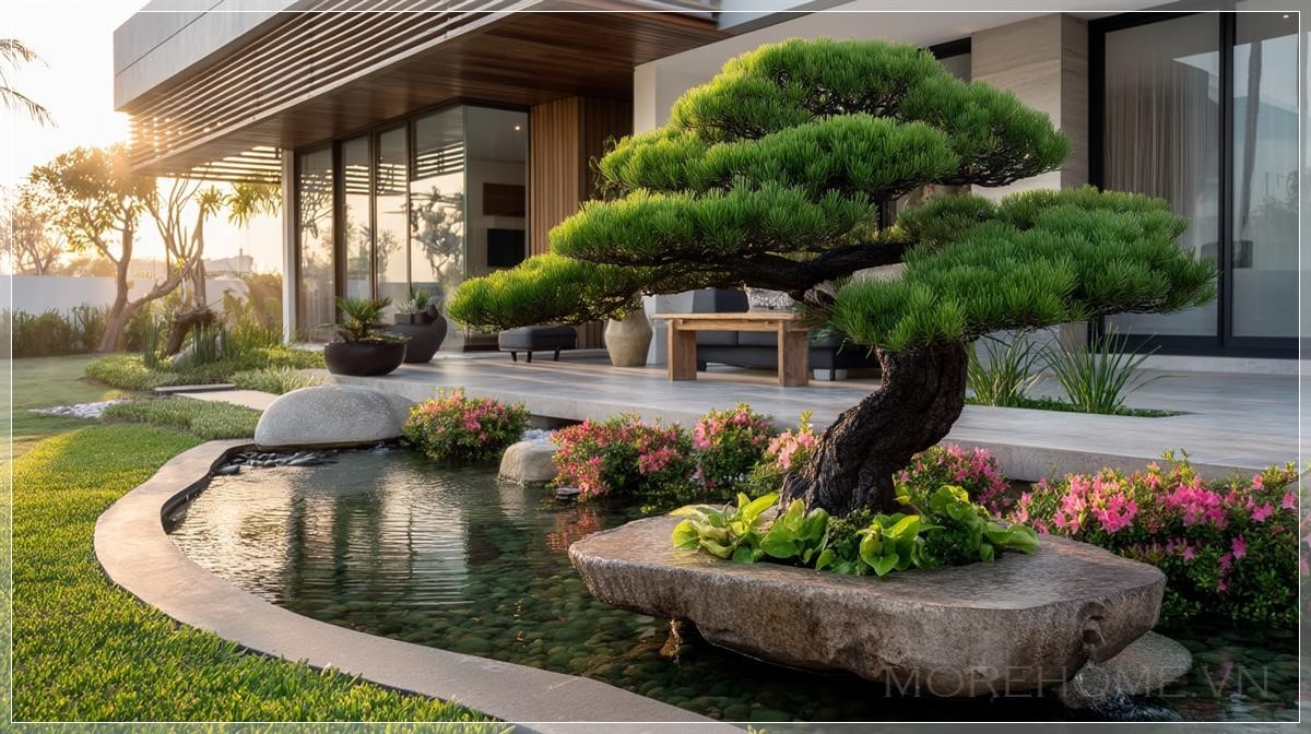 Điểm nhấn chính của khu vườn nằm ở khu vực trung tâm - một cây Thông Đen Nhật Bản (Japanese Black Pine) được trồng trực tiếp trên nền đá tự nhiên. Không như những cây bonsai thông thường được giữ trong chậu, cây thông này được trồng xuống đất nhưng vẫn giữ được dáng bonsai đặc trưng - thân cong vặn đầy nghệ thuật, tán lá xòe ra như một chiếc ô xanh tự nhiên. Xung quanh là những chậu bonsai Ficus được đặt trong những chiếc chậu tối giản, tạo nên sự tương phản tinh tế giữa sắc xanh đậm của lá và màu trung tính của chậu.