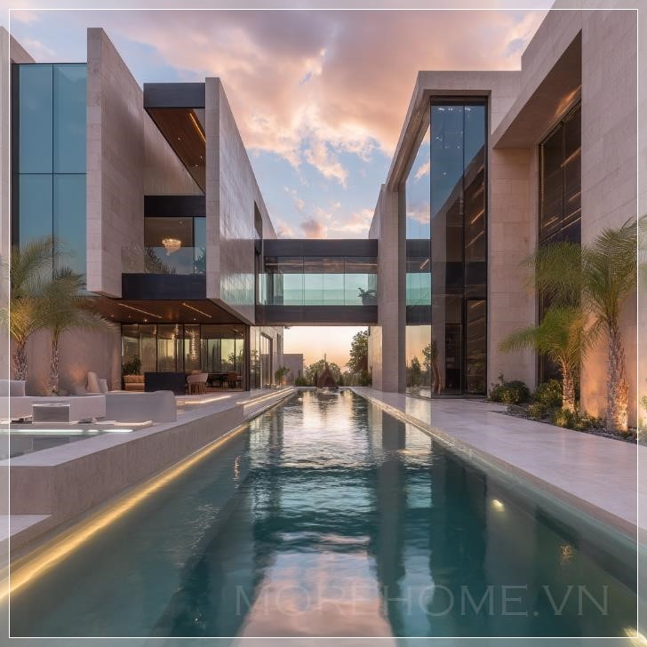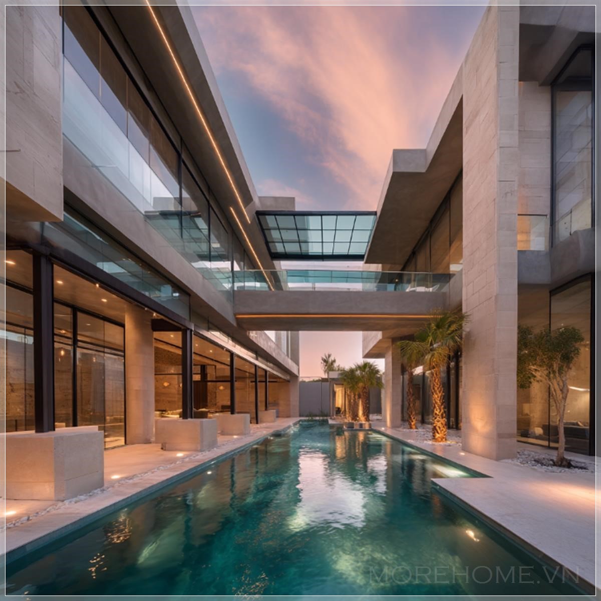 Cây cầu kính được bao kín hoàn toàn ở tầng hai không chỉ là một giải pháp kiến trúc thông minh mà còn là một tuyệt tác thị giác. Nối liền hai cánh chính của biệt thự, cây cầu này tạo ra một không gian riêng tư và độc đáo, nơi cư dân có thể ngắm nhìn toàn cảnh sân trong từ góc nhìn cao. Từ đây, họ có thể chiêm ngưỡng hồ bơi vô cực chạy dài dưới chân cầu, tạo nên một khung cảnh như trong những bộ phim điện ảnh.