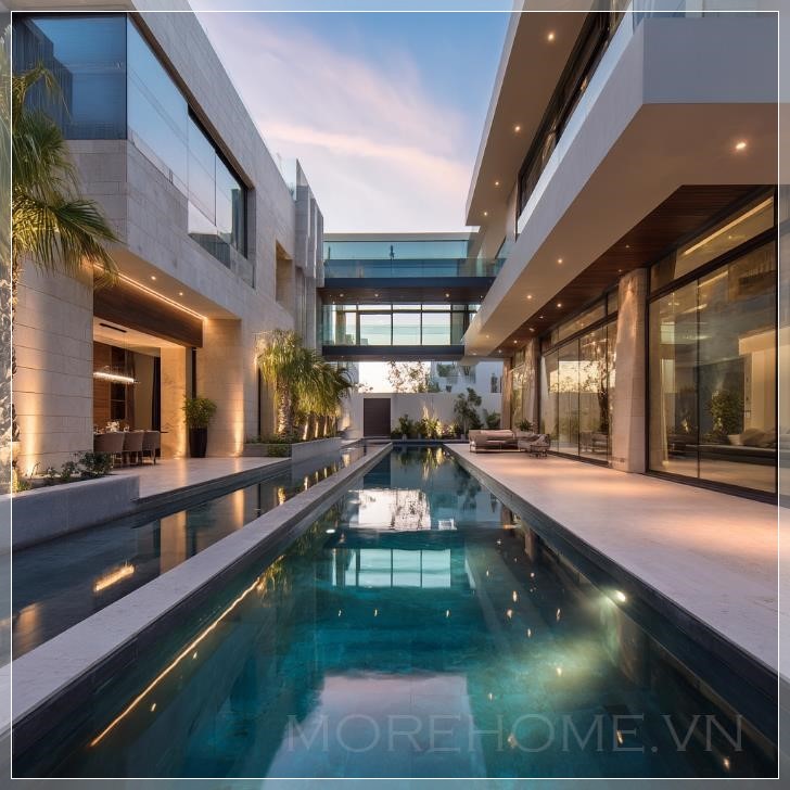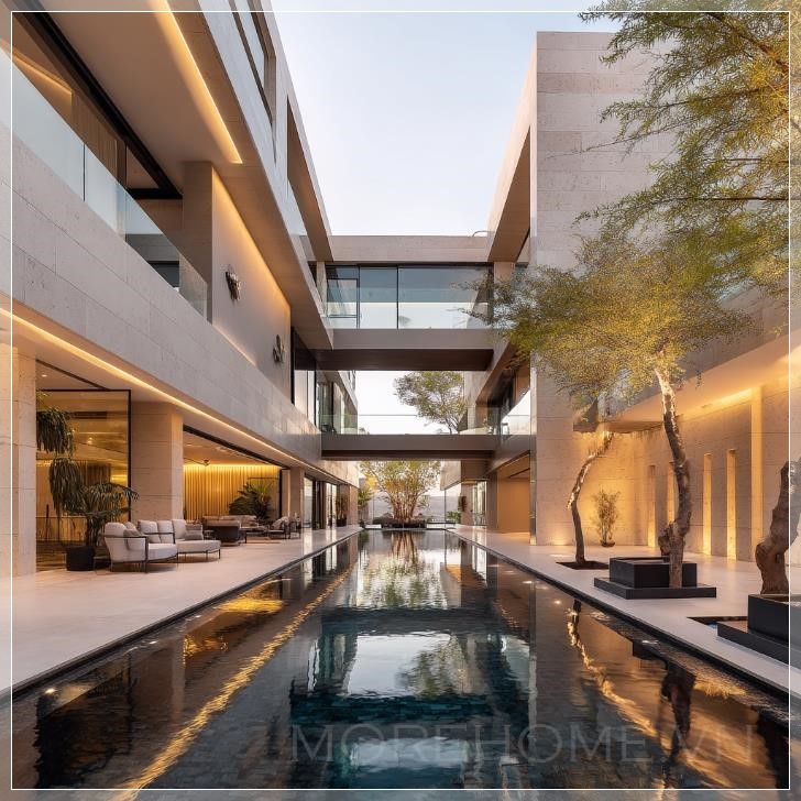 Điểm thu hút đầu tiên chính là sân trong trung tâm rộng lớn, được thiết kế như một ốc đảo xanh mát giữa lòng kiến trúc bê tông và kính. Không gian này không chỉ mang lại cảm giác thông thoáng mà còn tạo ra một kết nối tự nhiên giữa các khu vực khác nhau của ngôi biệt thự. Ánh sáng tự nhiên tràn ngập qua không gian mở, tạo nên những khoảnh khắc lung linh khi tia nắng nhảy múa trên mặt nước hồ bơi vô cực.