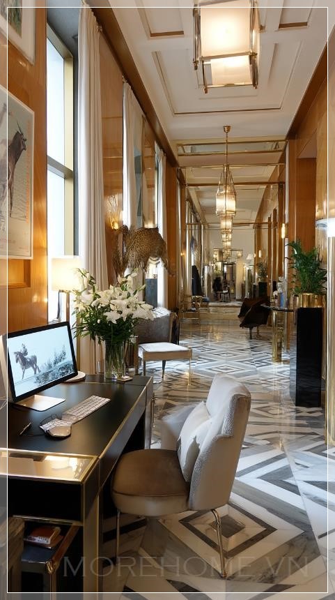 Ánh sáng tự nhiên từ cửa sổ lớn phía trước sảnh len lỏi qua những tấm rèm lụa màu kem, tạo nên những khoảnh khắc chơi ánh sáng tuyệt đẹp trên các bề mặt kim loại và đá cẩm thạch. Vào buổi chiều, khi ánh hoàng hôn Paris nhẹ nhàng chiếu vào, toàn bộ không gian như được phủ một lớp vàng ấm áp, khiến mọi đường nét Art Deco trở nên sống động và quyến rũ hơn bao giờ hết.