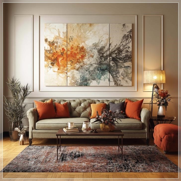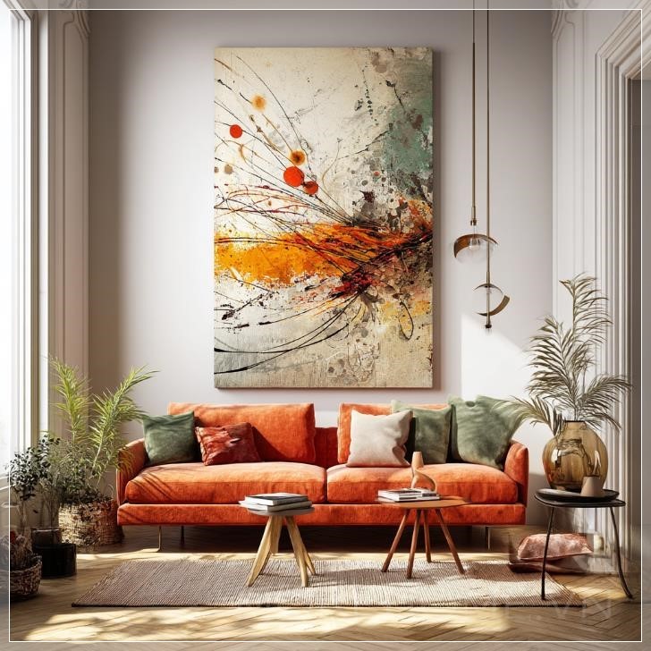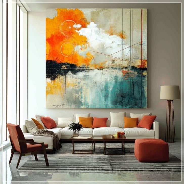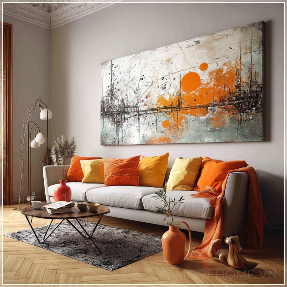 Bức tranh trừu tượng với tông màu kem và cam này không chỉ là một tác phẩm nghệ thuật, mà còn là minh chứng cho việc làm thế nào để biến một không gian thông thường thành nơi truyền tải cảm xúc và câu chuyện. Nó gợi nhắc chúng ta rằng, nghệ thuật có sức mạnh biến đổi không chỉ không gian vật lý mà còn cả trạng thái tinh thần của con người, tạo ra một môi trường sống không chỉ đẹp mắt mà còn nuôi dưỡng tâm hồn.