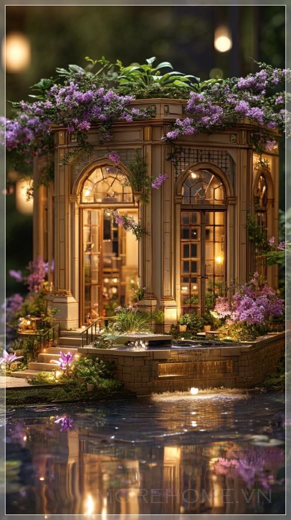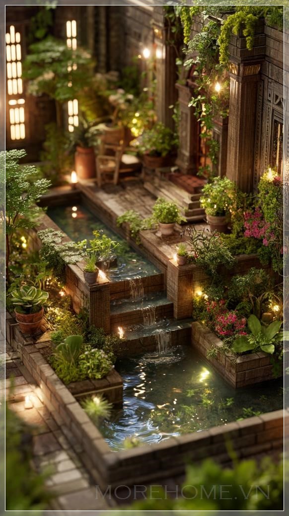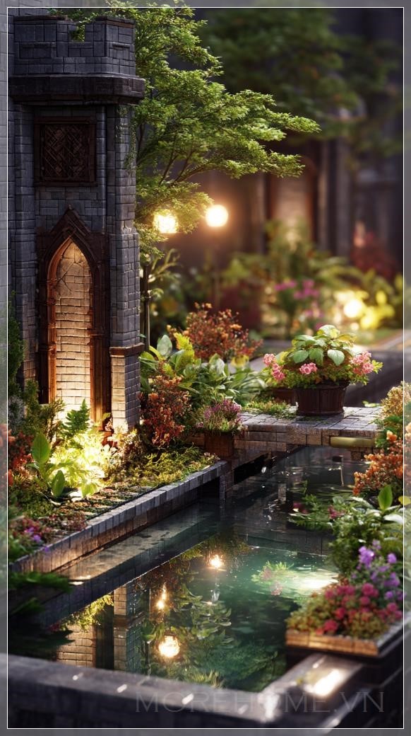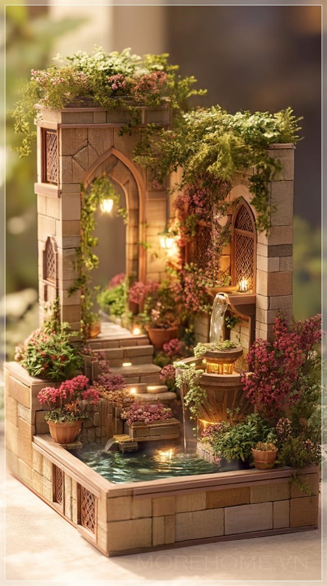 Với những chi tiết tinh xảo, từ các chậu cây được làm thủ công đến những cấu trúc kiến trúc độc đáo như cầu nhỏ hay lối đi đá, mỗi phần của khu vườn miniature đều được chăm chút tỉ mỉ. Nước trong các bể nước nhỏ lấp lánh dưới ánh sáng mềm mại, tạo ra một cảm giác thanh thoát và dễ chịu. Những bông hoa đang khoe sắc, những cây cỏ mềm mại tạo nên một không gian đầy sắc màu và sự sống.